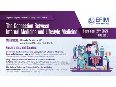 The EFIM Early Career Group is pleased to invite you to our upcoming webinar on “The Connection Between Internal Medicine and Lifestyle Medicine”, taking place on Wednesday, 24 September at 18:00 CEST.